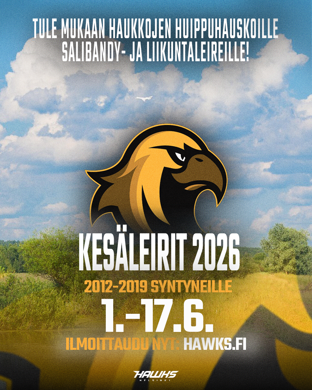 Hawks Helsinki järjestää kesälomalla (viikot 23, 24 ja 25) salibandy- ja liikuntaleirit 2012-2019 syntyneille lapsille Myllypuron Arena Centerillä. Leiripäivien aikana opetellaan salibandyn lajitaitoja, pelataan erilaisia pallopelejä, kilpaillaan ja pidetään hauskaa. Leiripäivien aikana myös liikutaan ja leikitään monipuolisesti sekä sisällä että ulkona. Voit ilmoittautua yhdelle tai useammalle leiriviikolle.