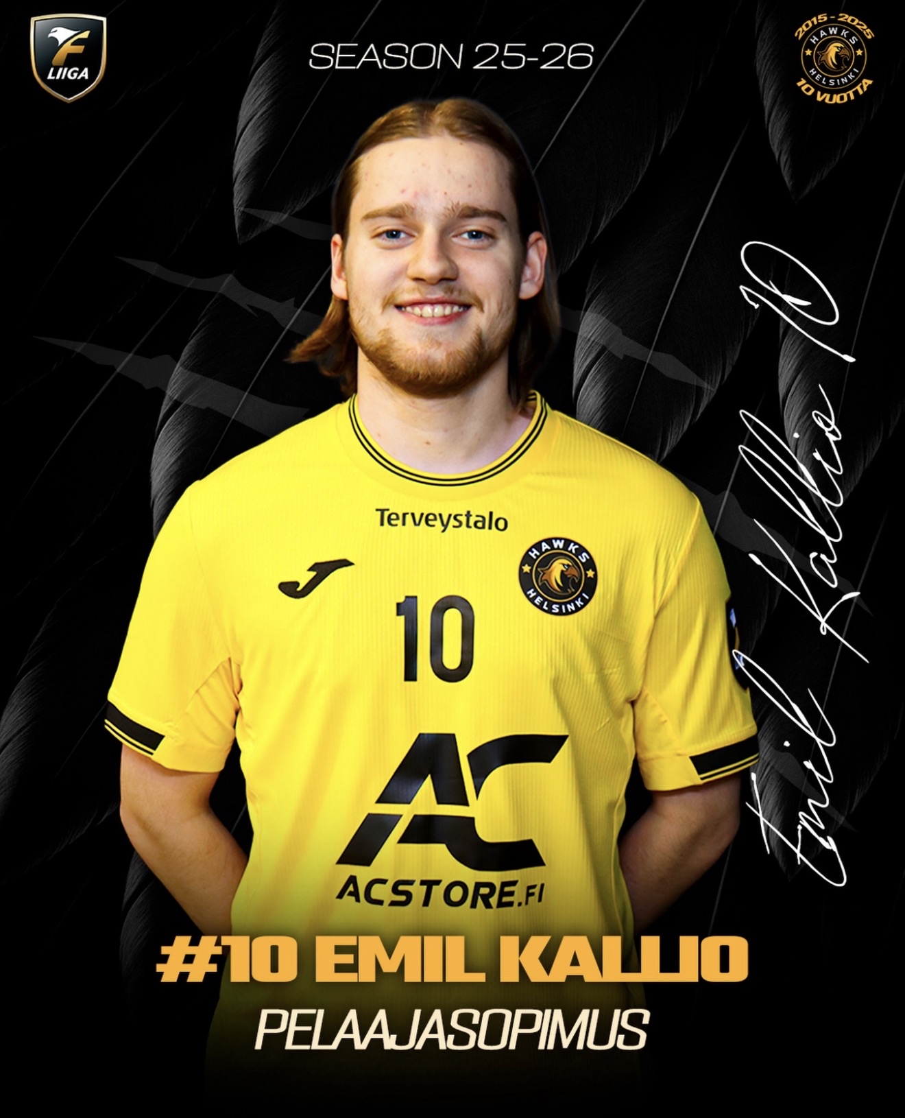 Pelaajasopimus: Emil Kallio 8.1.2026 Emil Kallio liittyy Haukkojen rosteriin ja on joukkueen vahvuudessa heti perjantain TPS-vierasottelussa. Emil tuo joukkueen hyökkäykseen taitoa ja viekkautta. Hän on aiemmin pelannut F-liigaa Oilersissa ja Tiikereissä. Tervetuloa Emil! Pistä uutinen lentoon... Edellinen artikkeliLauantaina stadin derby vol 2 - lisäkatsomo avataan!Seuraava artikkeli Turku weekend 2/2: HAWKS - FBC TURKU
