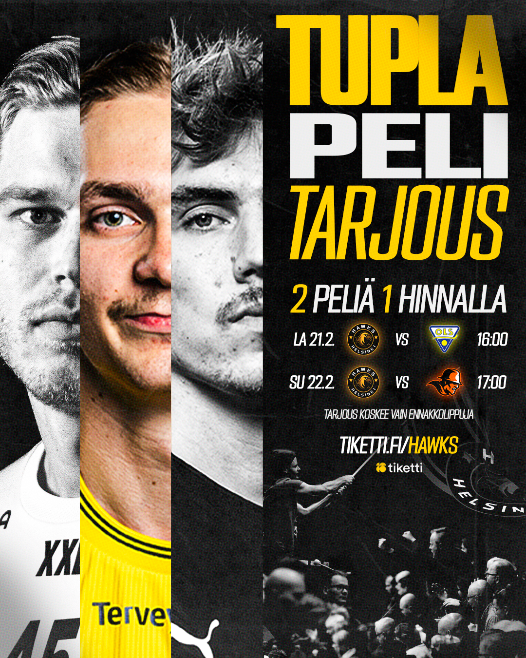Sen kunniaksi saat nyt viikonlopun molemmat matsit yhden hinnalla! Tarjous koskee ainoastaan ennakkoon Tiketistä ostettuja lippuja ja on voimassa ensimmäiseen peliin saakka (21.2.).